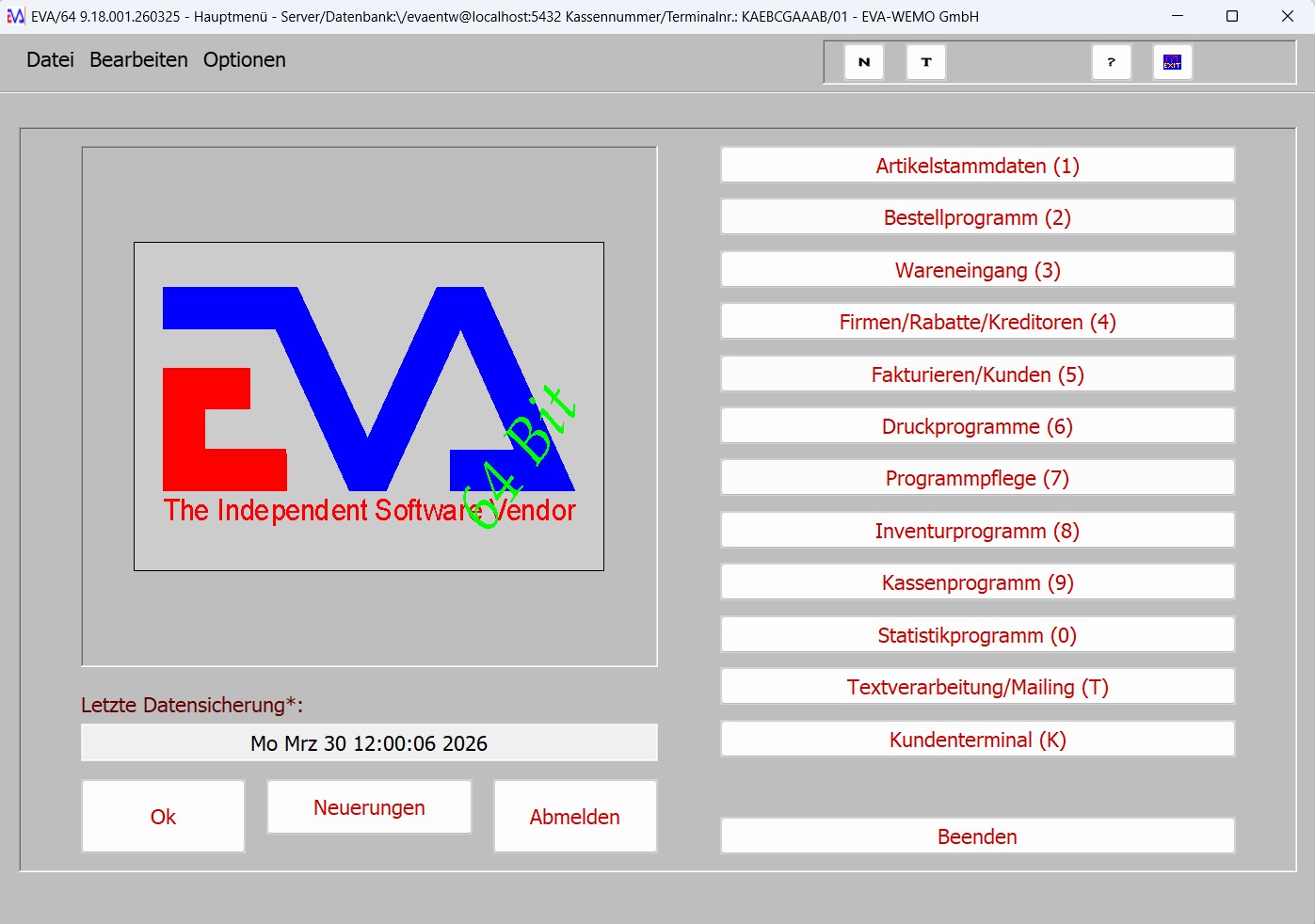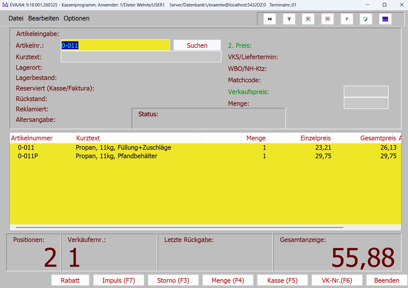 Kassenprogramm: Abverkauf von Artikeln über Kassenbon (mit Kassenbondrucker, Kasenschublade und ggf. Kundendisplay und Kassentastatur), Kassiervorgänge: (BAR, Scheck, Gutscheine, EC, Kreditkarte, Kredit), Kundenreservierungen mit Anzahlungen, Geldentnahmen, Kassenbuch, Kassenabschluss mit Buchungsjournalen (auch als Rechnungsausgangsbuch verwendbar), Stornojournal, Z-BON, Abverkaufslisten