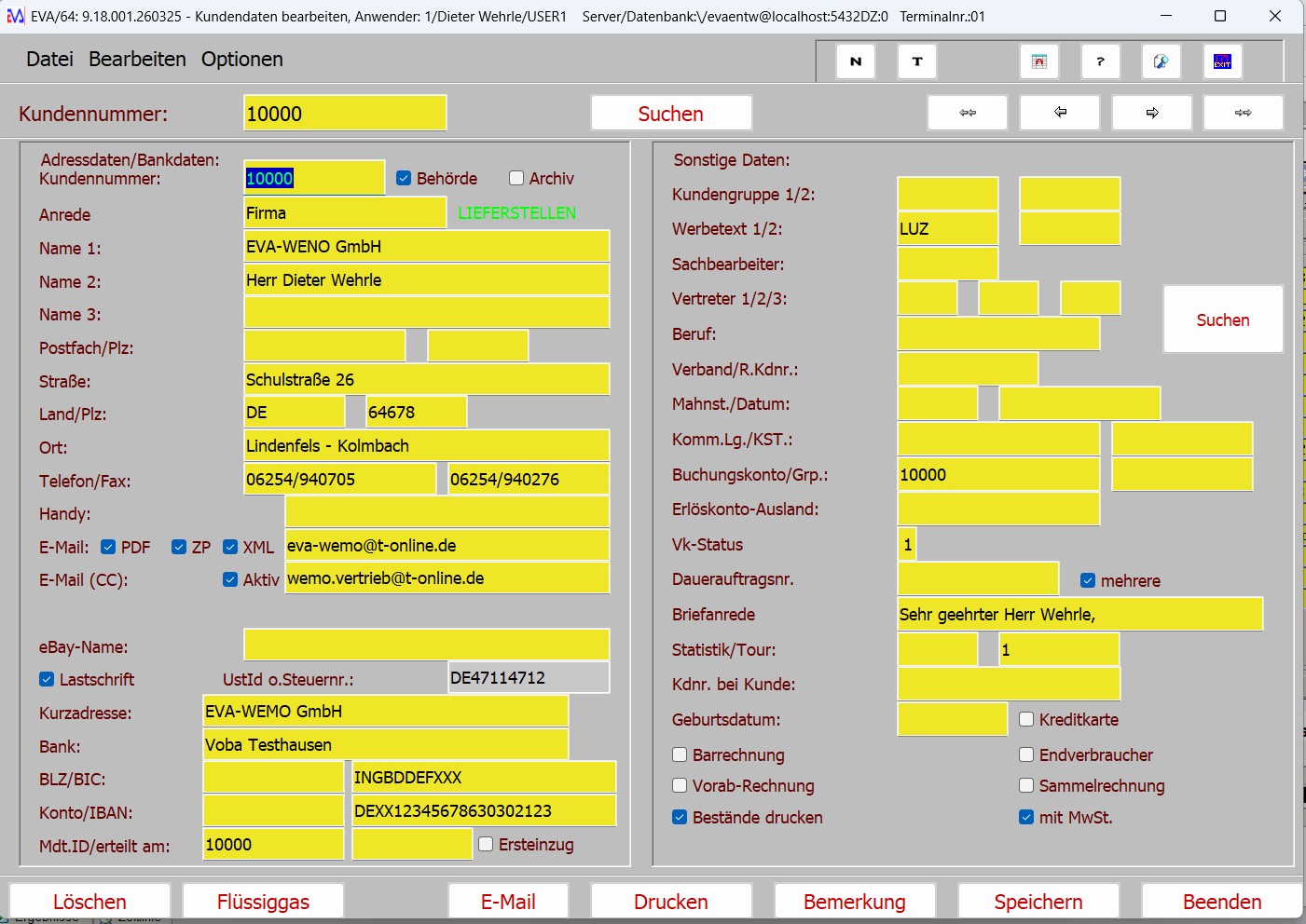 Finanzbuchhaltung: Alle Debitoren- und Kassenbuchungsdaten können Sie über eine DATEV, ASCII, CARBO, RZA oder SIMBA-Schnittstelle zu der entsprechenden Finanzbuchhaltung exportieren. Splitbuchungen werden natürlich berücksichtigt. Zahlungen, die in EVA verbucht wurden, werden ebenfalls übergeben.